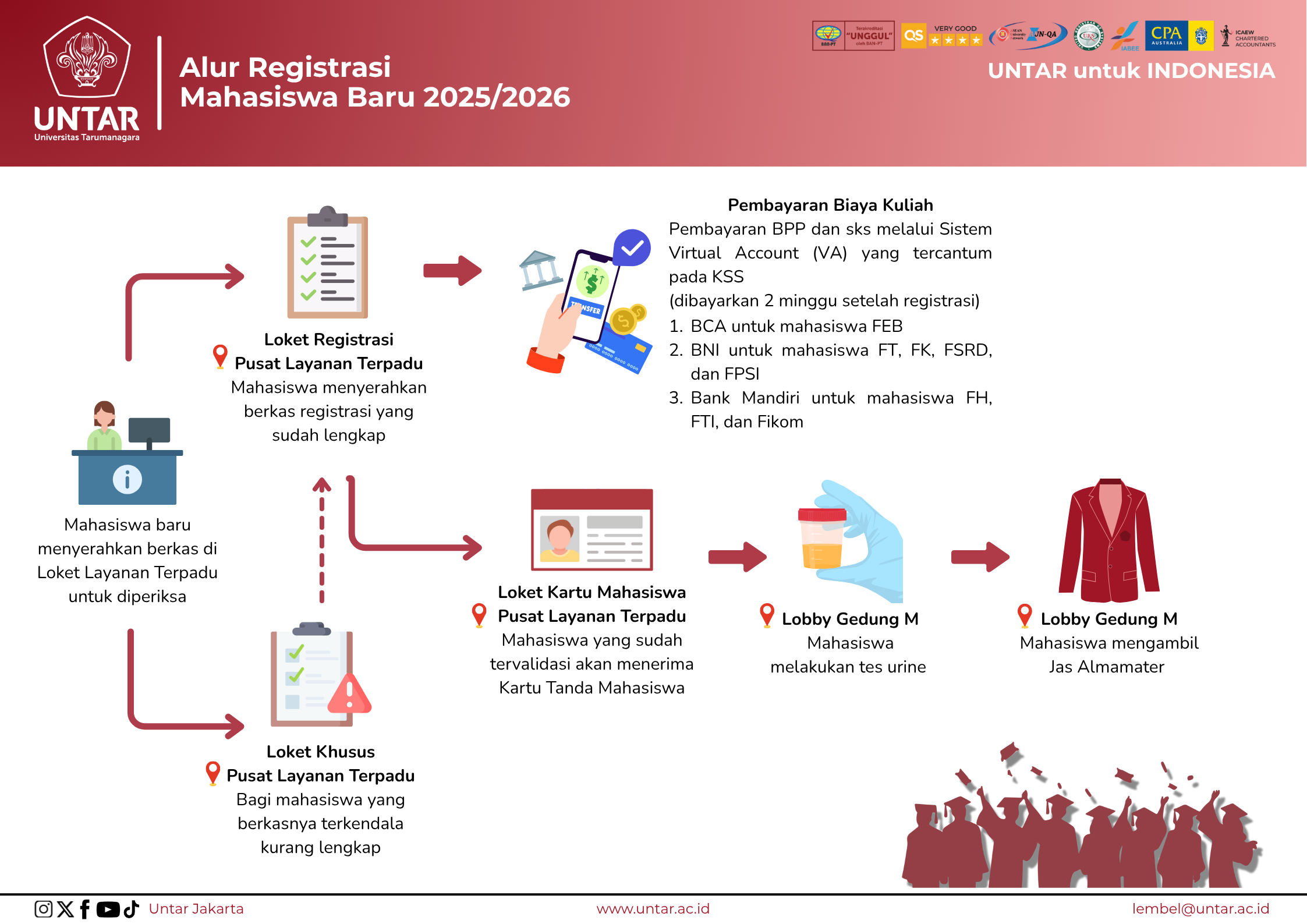 Universitas Tarumanagara (Untar) menetapkan alur registrasi mahasiswa baru tahun akademik 2025/2026 yang tersusun secara sistematis untuk memastikan kelancaran proses administrasi. Mahasiswa baru diminta untuk menyerahkan dokumen yang telah disiapkan ke Loket Layanan Terpadu. Apabila berkas dinyatakan lengkap, proses registrasi dapat langsung dilanjutkan. Jika terdapat kekurangan, mahasiswa akan diarahkan ke loket khusus untuk penyelesaian administrasi. Setelah registrasi, mahasiswa akan menerima informasi pembayaran biaya pendidikan melalui virtual account sesuai dengan fakultas masing-masing. Tahapan berikutnya meliputi penerbitan Kartu Tanda Mahasiswa (KTM), pelaksanaan tes urine, dan pengambilan jas almamater. Dengan mengikuti seluruh tahapan ini, mahasiswa resmi bergabung dalam komunitas akademik Universitas Tarumanagara.